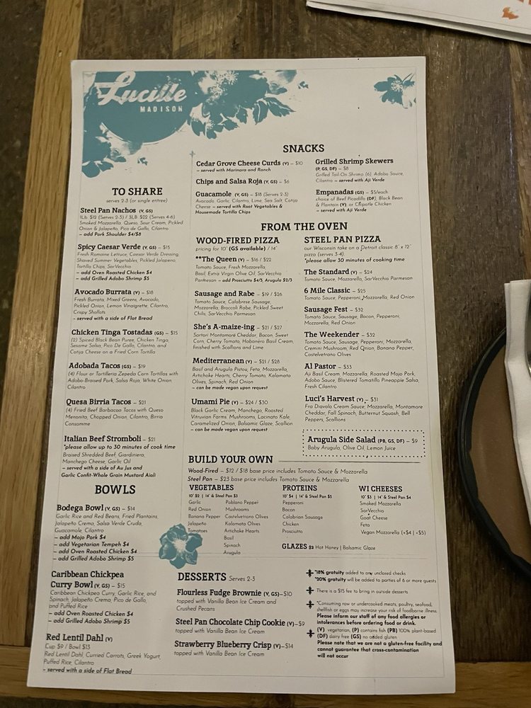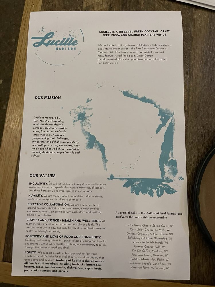 Lucille is a trendy New American - Pizza restaurant located in Madison, WI offering wood-fired pizzas, steel pan options, and a variety of appetizers and entrees. The cozy and chic atmosphere, complete with Christmas decorations during the holiday season, makes it a perfect spot for group gatherings. Customers rave about the wood-fired pizzas, loaded with fresh toppings and baked to perfection in the in-house wood-burning brick pizza oven. The menu also includes Detroit-style pizzas and unique dishes like Adobada Tacos and Bodega Bowl. The festive holiday-themed drinks and vintage Christmas cups add to the overall experience. The staff is friendly and accommodating, ensuring a pleasant dining experience. Whether you're looking for a casual meal, a special event, or just a cozy spot to unwind, Lucille has something for everyone.